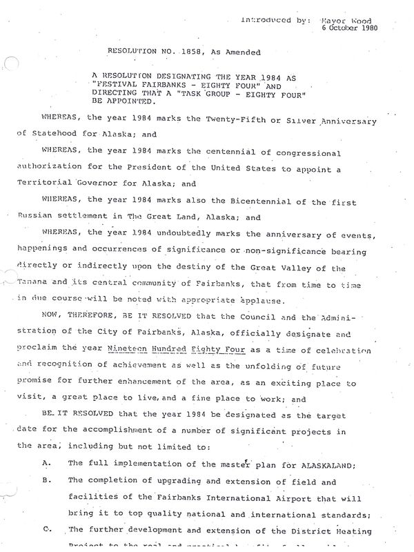 The Fairbanks City Council officially designated Festival Fairbanks through Resolution No. 3421 to: "plan, organize, develop and coordinate commemorative activities for the Centennial of the City of Fairbanks."